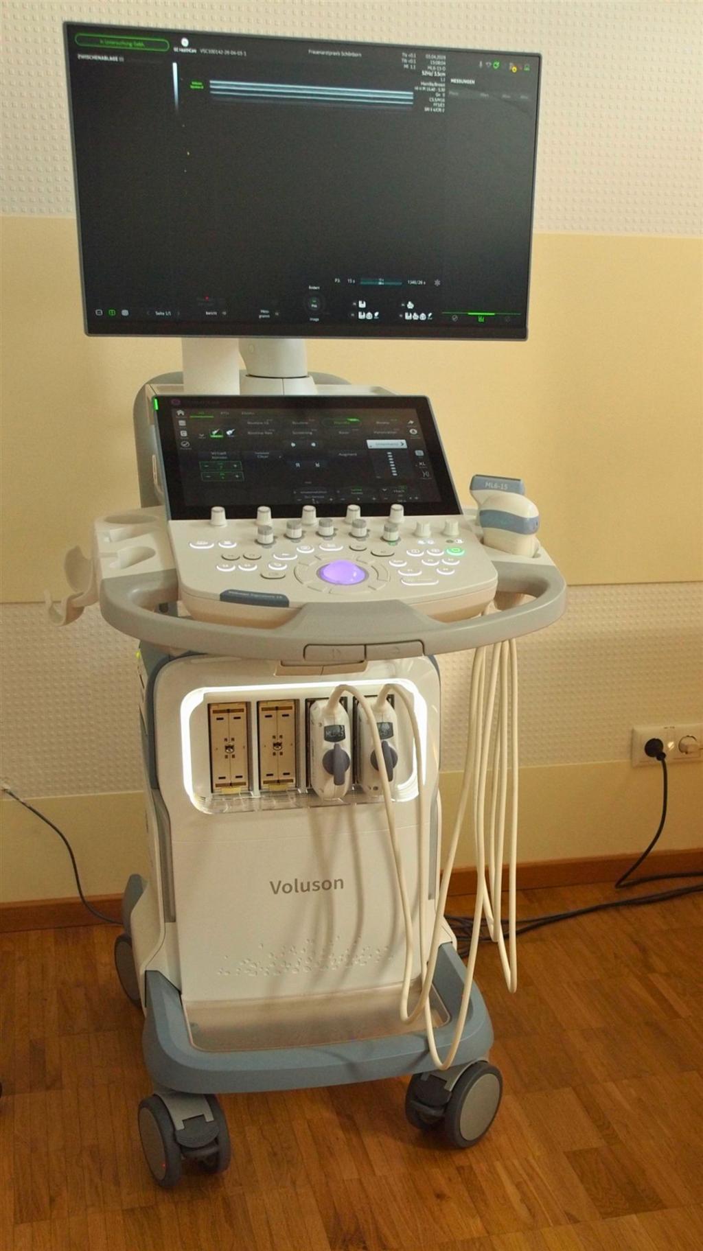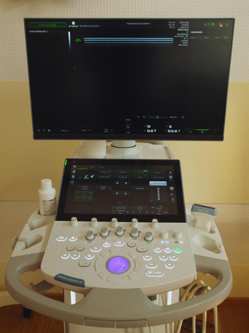 Alle Untersuchungen der Brust werden mit dem hochmodernen High-End Ultraschallgerät der Firma GE (GE Voluson Signature 18) durchgeführt, welches mit einem hochauflösenden linearen Matrix-Schallkopf (5-18 MHz), einem hochsensitiven HD-Farbdoppler und real-time 2D- Elastographie ausgestattet ist.